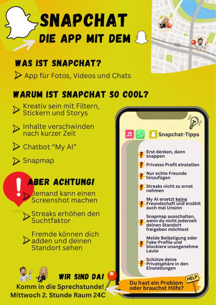 In unserem aktuellen Medienkompetenz-Newsletter dreht sich alles um die beliebte App Snapchat. Viele Schüler*innen nutzen sie täglich – doch nicht alle kennen die Risiken und Schutzmöglichkeiten. Unser Info-Poster erklärt leicht verständlich:
